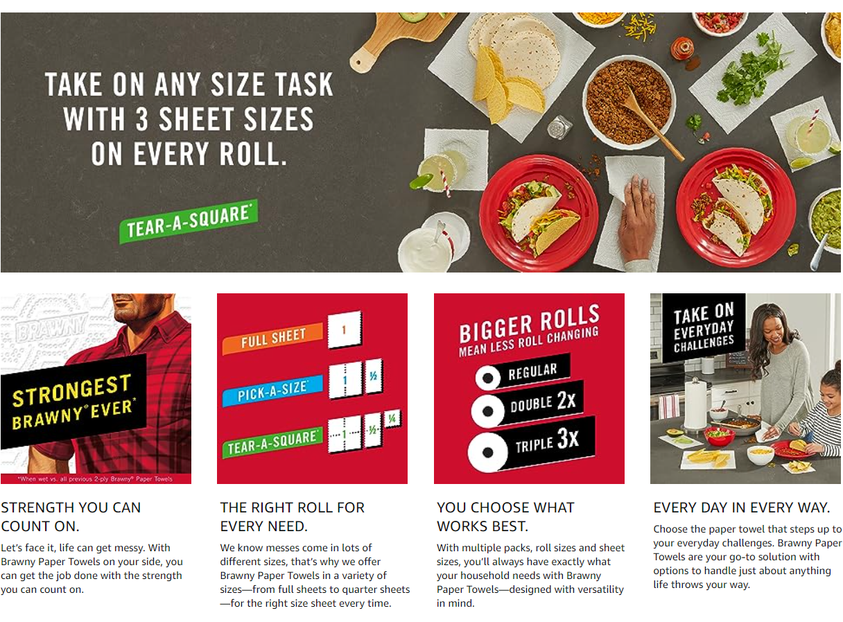 • Our strongest ever Brawny Tear-A-Square Paper Towels offer 3 sheet sizes (Quarter, Half and Full) so you get just what you need to fit the task.