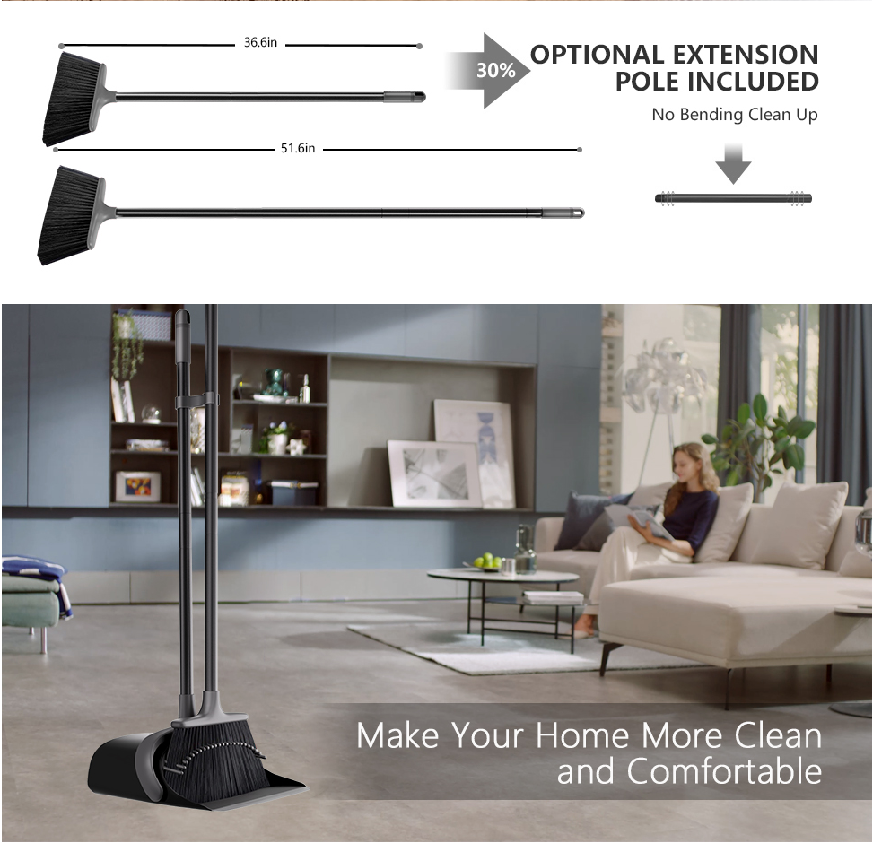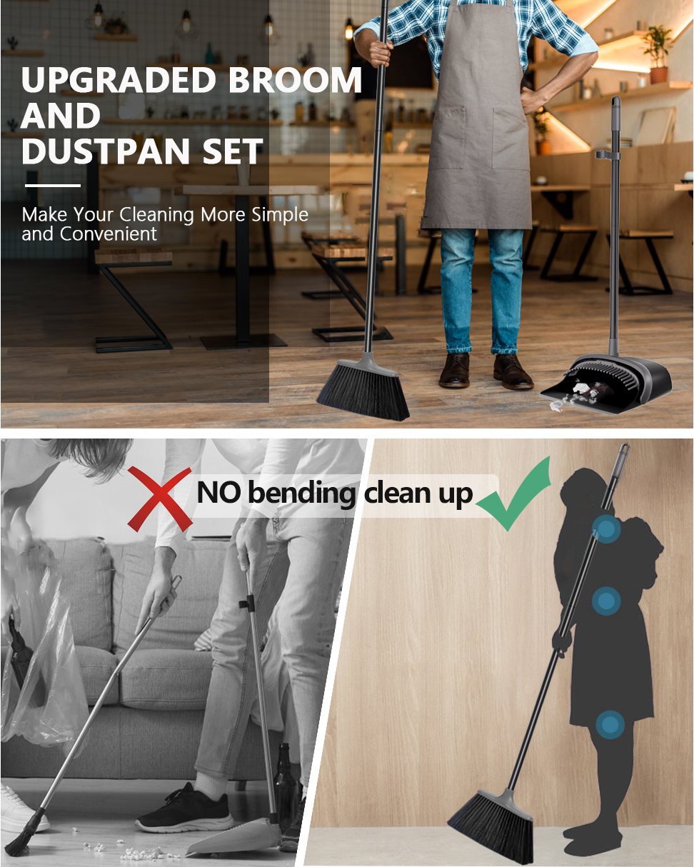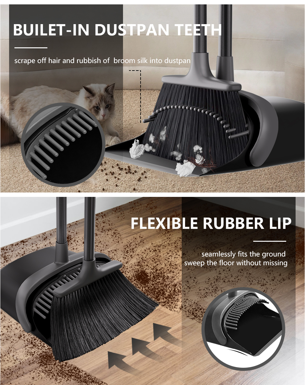 • Comb Design Dustpan: The broom with dustpan combo set has a comb tooth design, which is convenient to scrape the hair and debris on the broom into the standing dust pan and broom combo, no need to drag by hand, easy to clean human hair/pet hair and dust on the broom.
