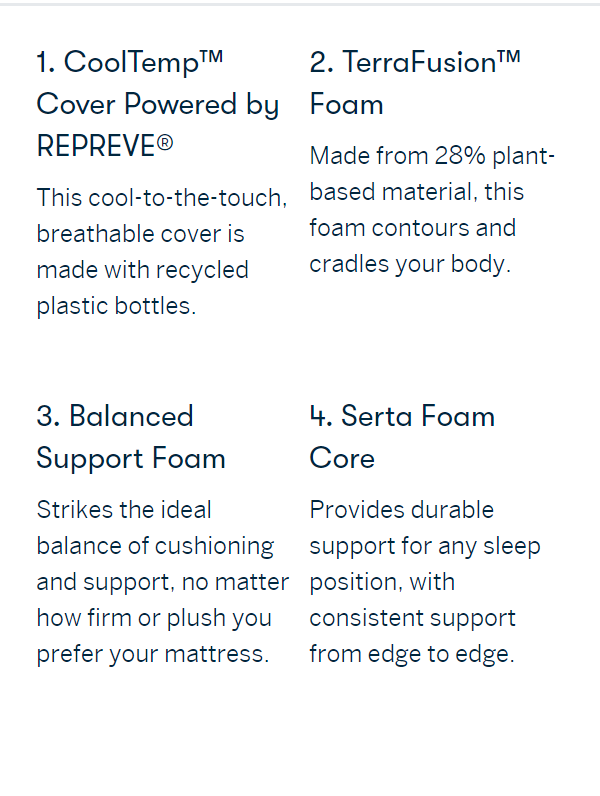- With more comfort, support, and sustainability, the all-foam iComfortECO delivers a better night's sleep that's easier on the earth. With eco-friendly materials like the CoolTemp™️ Cover Powered by Repreve®, a cool-to-the-touch, breathable cover made with the recycled plastic equivalent to 120 water bottles* and Terra Fusion™️ Memory Foam made from 28% plant-based material that provides pressure relief, cradling comfort, and reduces motion transfer for uninterrupted sleep. Designed with edge-to-edge support, ideal for any sleep position, so you rest comfortably all night long.