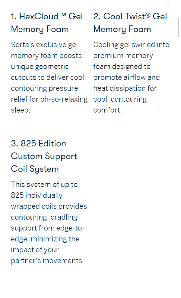 • Provides contouring, cradling support with up to 825 individually wrapped coils and features an extra-deep foam rail to help reduce edge roll-off and extend the sleep surface